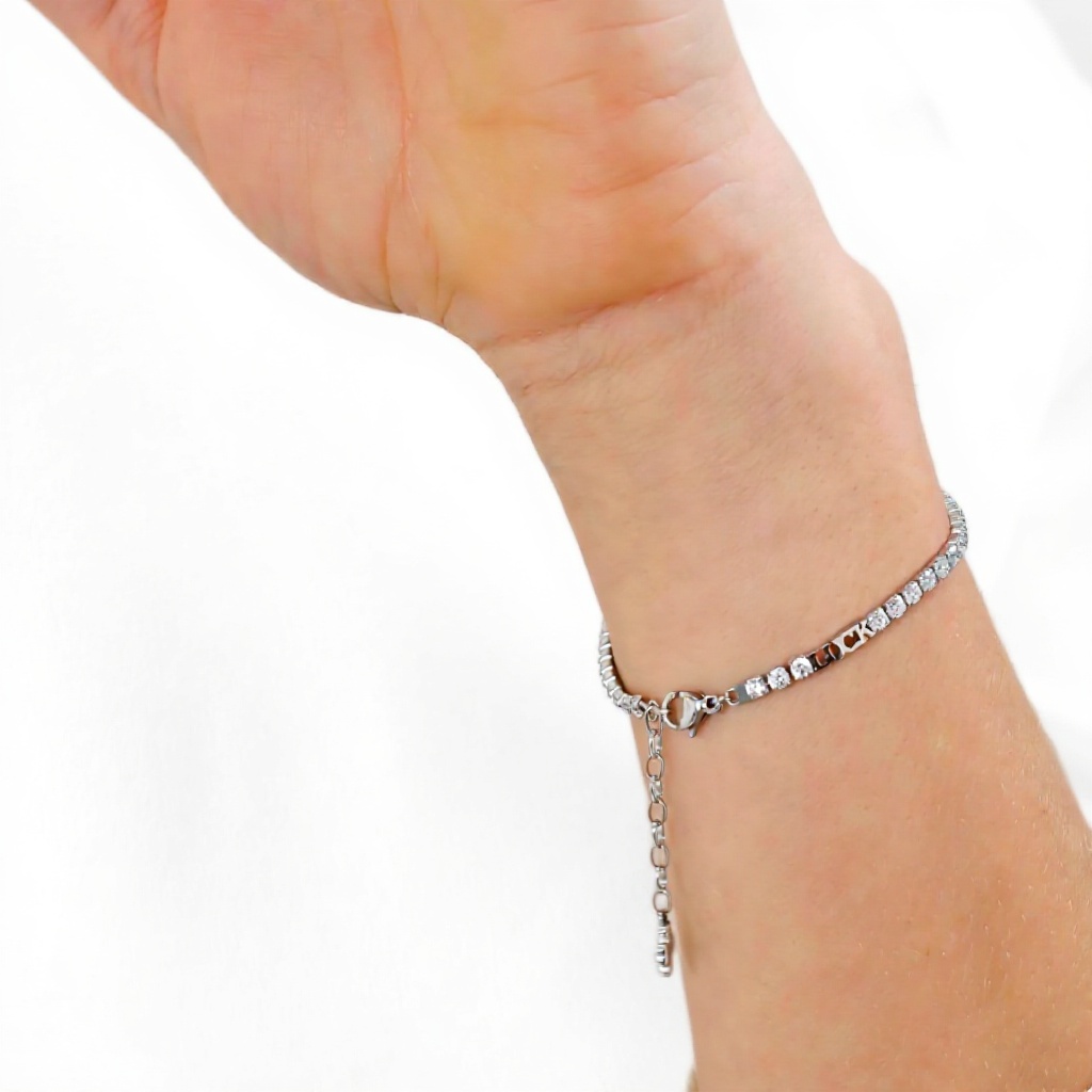 Il bracciale è realizzato in acciaio 304 e cubic zirconia, materiali noti per la loro durabilità, resistenza alla corrosione e proprietà ipoallergeniche, ideali per un uso prolungato senza irritazioni.