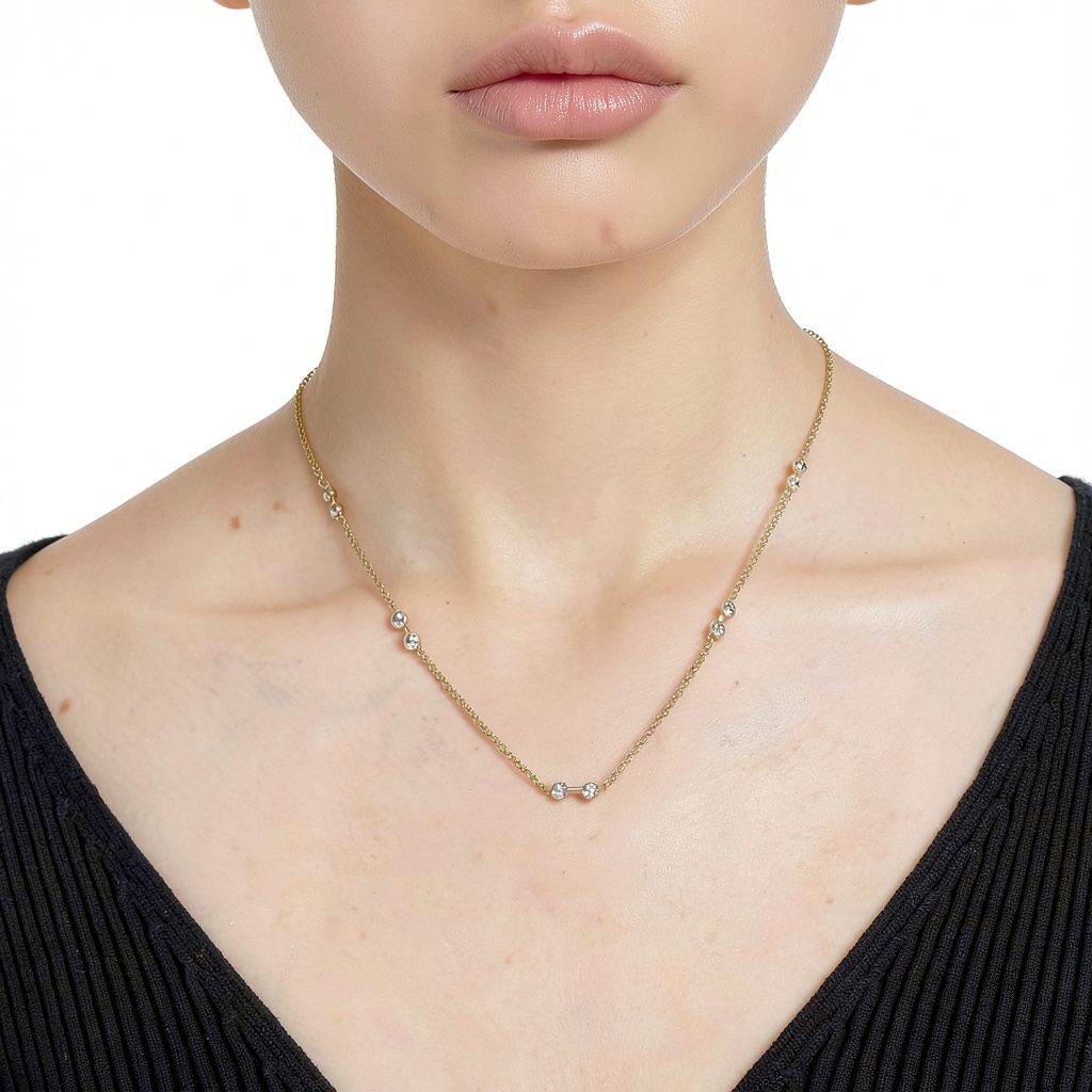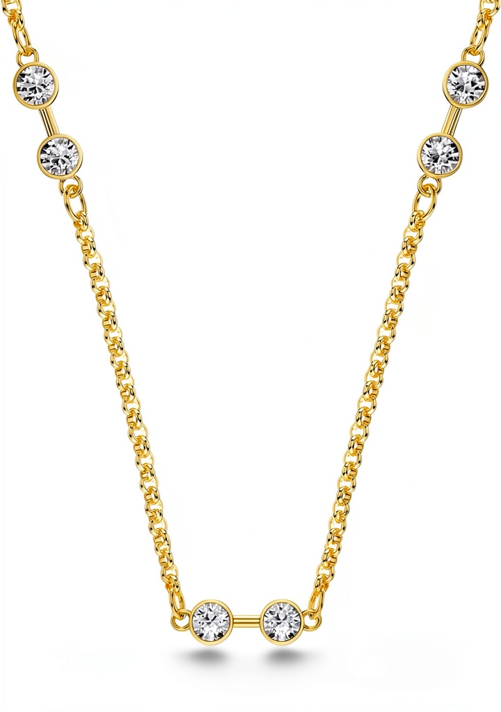La collana è disponibile in Rodio Placcato Bianco e Tonalità Oro Placcato Bianco, entrambe con cristalli bianchi per un aspetto luminoso e raffinato.