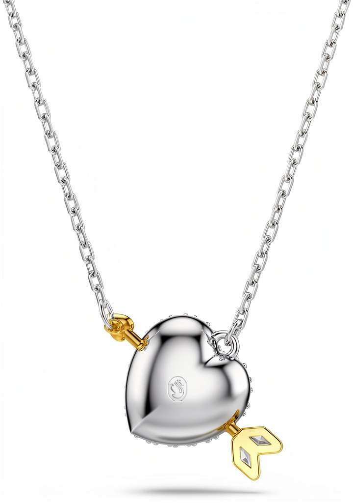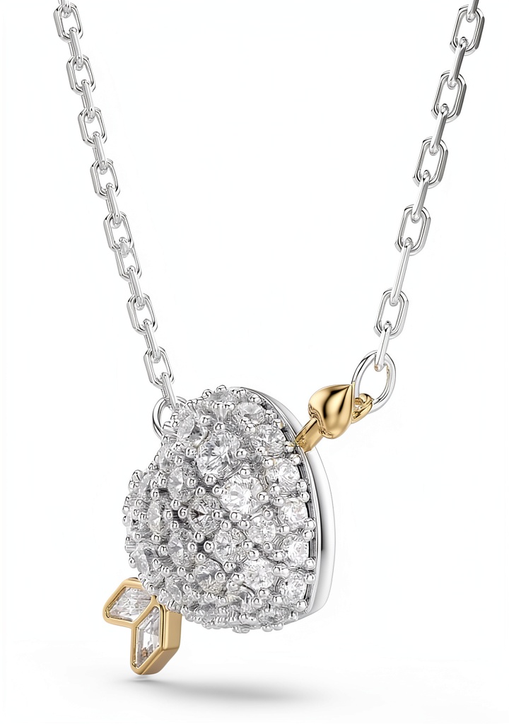 Il pendente Swarovski Idyllia è un gioiello raffinato che unisce eleganza e simbolismo. Realizzato con un design a cuore in taglio misto, presenta finiture in rodio e oro, arricchite da Swarovski Zirconia trasparenti che creano un effetto scintillante. La freccia di Cupido placcata in tonalità oro attraversa il cuore, aggiungendo un tocco romantico. Con dimensioni di 6,9 x 6,8 x 2,7 cm e un peso di 6,1 grammi, questo pendente è sospeso a una catena sottile per un look delicato e femminile. Prodotto da Swarovski, garantisce qualità e durata nel tempo, ideale per chi cerca un accessorio di lusso.