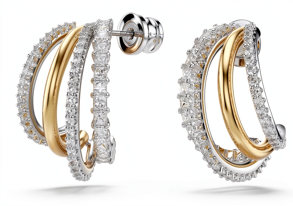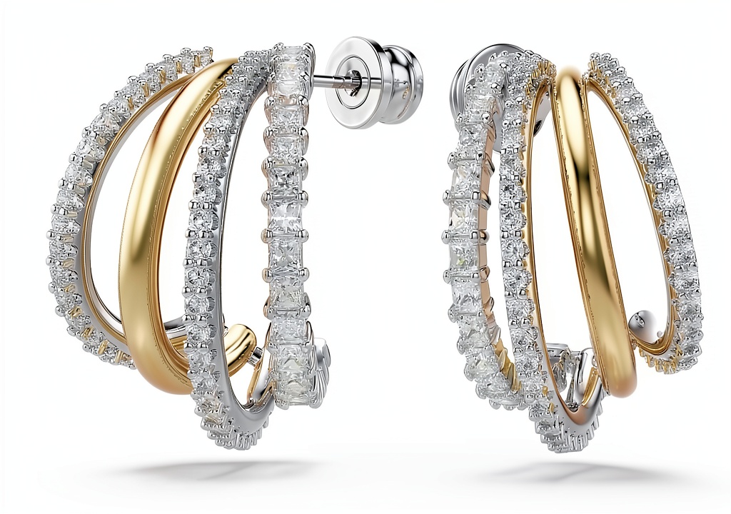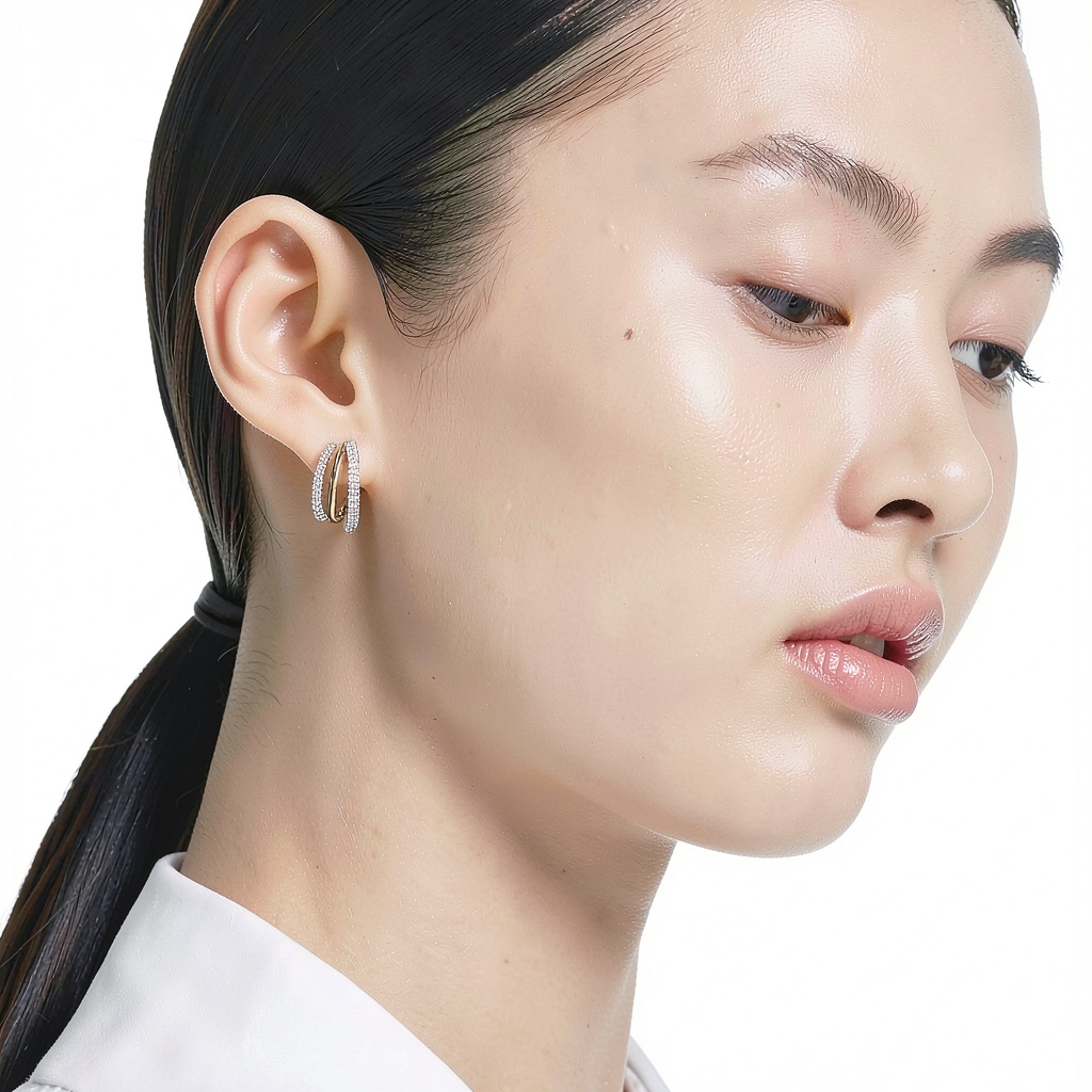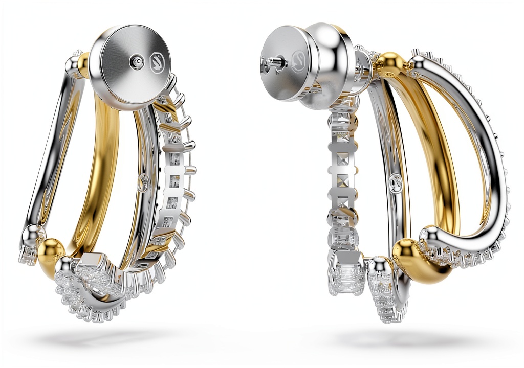 The Swarovski Hyperbola earrings feature combinations of gold and rhodium plating with white accents, creating beautiful contrast in the design. The specific color options include gold with white and rose gold with white variations.