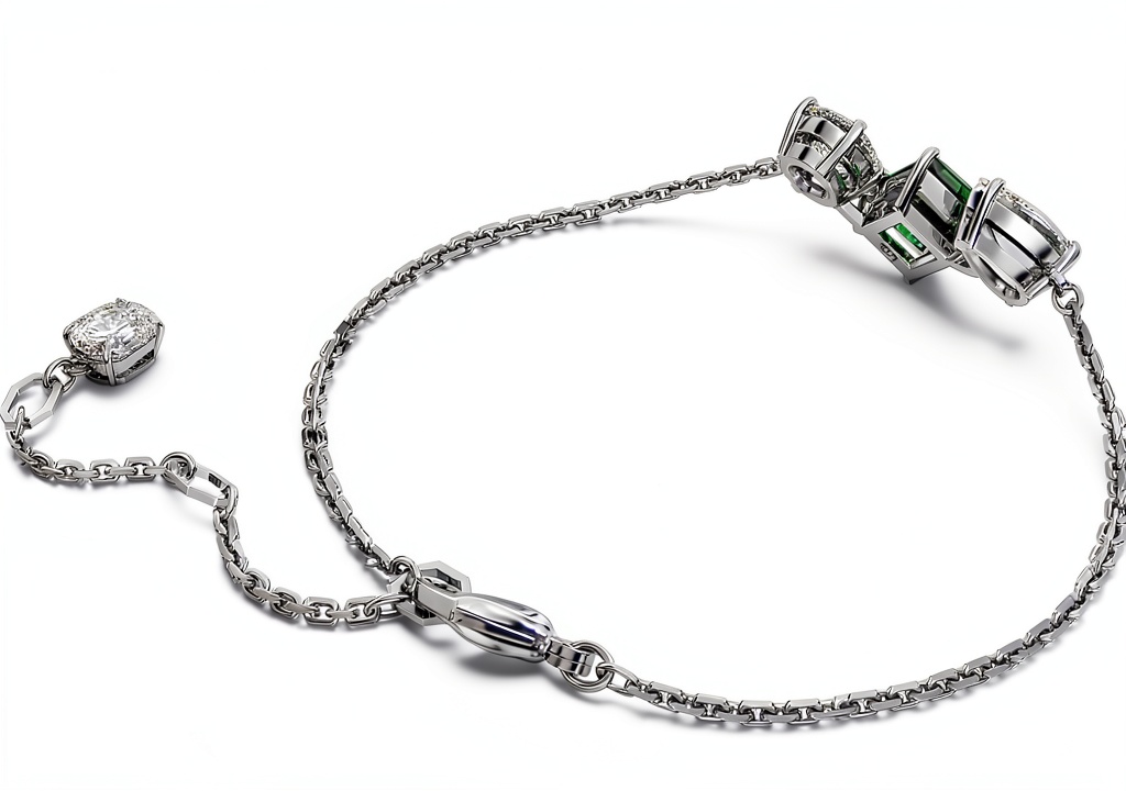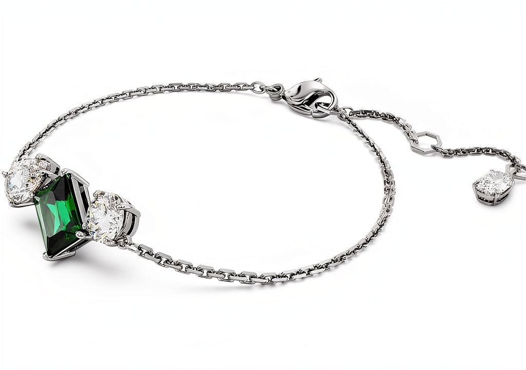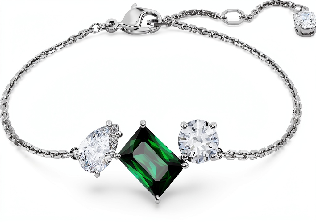 Il bracciale è realizzato con placcatura in rodio e include Swarovski Zirconia, tra cui una pietra centrale verde, garantendo brillantezza e resistenza.