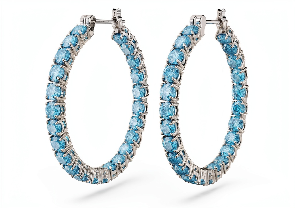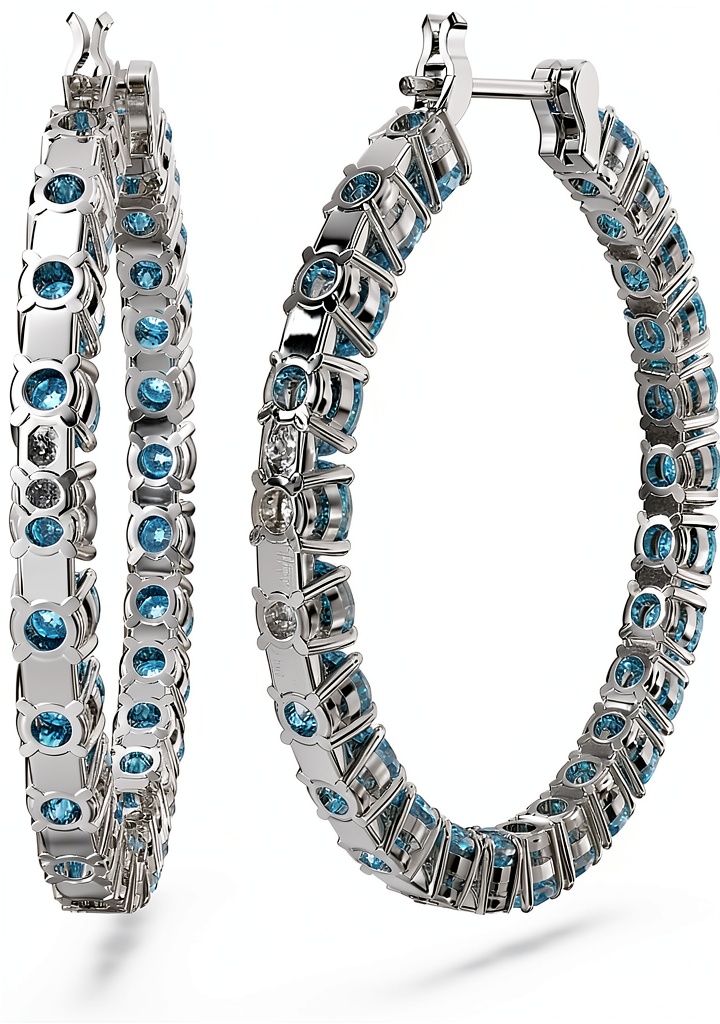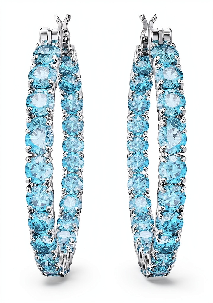Gli orecchini Swarovski Matrix Collezione presentano un design a cerchio di 3 cm di diametro, realizzati con montatura placcata rodio e pavé completo di zirconi blu a taglio tondo. Ogni orecchino pesa 9,37 g, garantendo comfort e stabilità. La finitura rodio aggiunge luminosità e resistenza, mentre le pietre Swarovski riflettono la luce in modo impeccabile, creando un effetto brillante e raffinato.