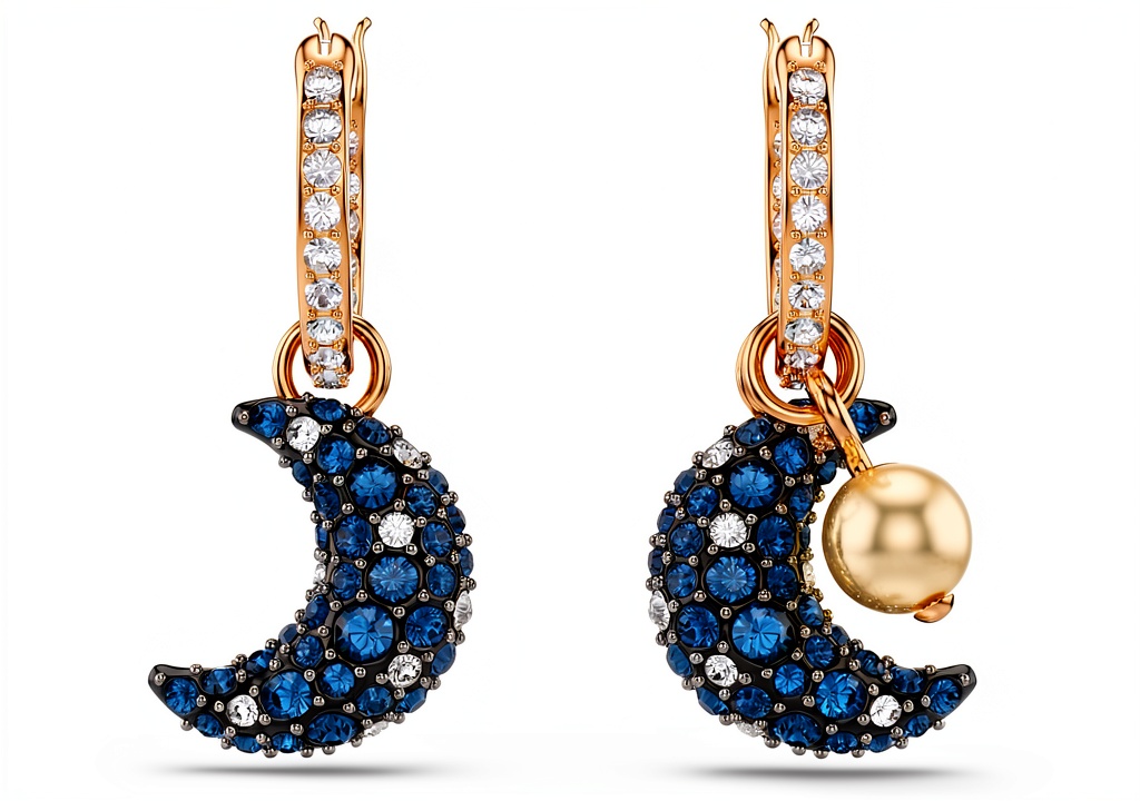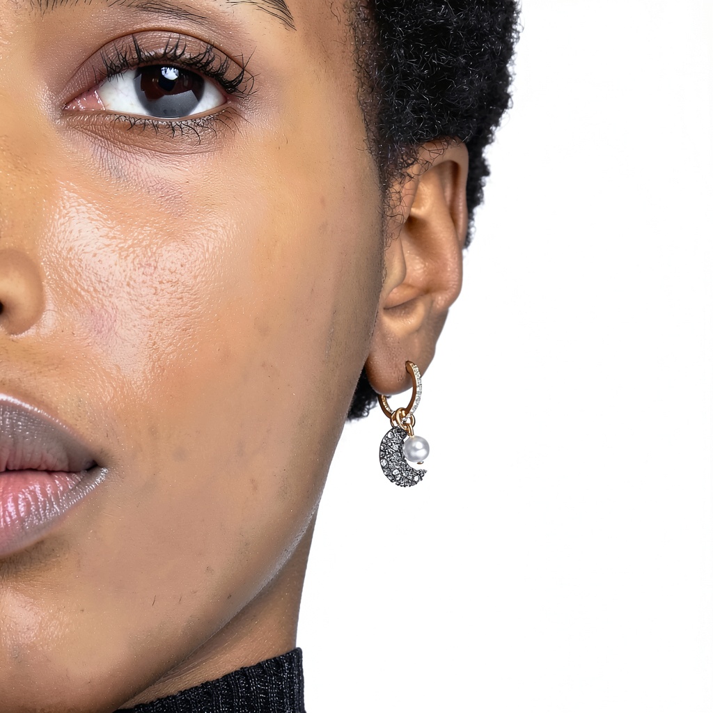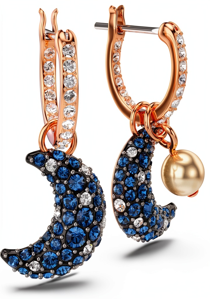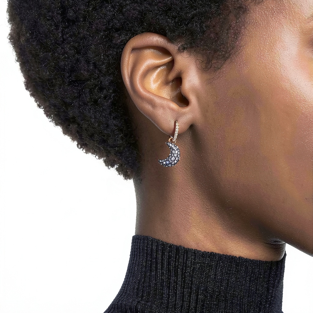 The Swarovski Sublima earrings feature an elegant design inspired by the moon’s reflections and shadows. Crafted with rose gold plating, each earring includes a pair of crescent shapes adorned with dark crystal pavé and dangling from sparkling mini circles. One earring is enhanced with a removable pearl, adding a touch of sophistication and customization to your look.