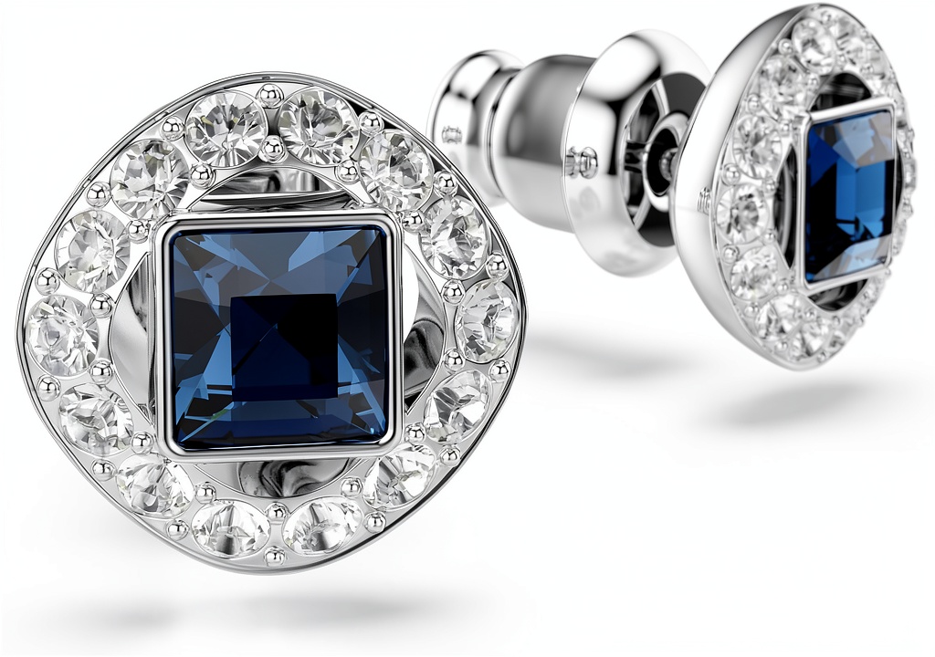 Gli orecchini sono realizzati con una finitura placcata rodio e incorporano cristalli Swarovski Cry, noti per la loro purezza e riflessi luminosi. La pietra centrale è in cristallo blu ghiaccio, garantendo un aspetto elegante e resistente all’usura quotidiana.